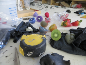 Scenes from the studio, I was casting multiple colored resin kiwis. Credit: David Altmejd Studio