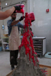 Studio scene: Me mid mold-making process pouring silicon over a plasticine work.