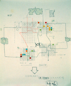 Lottery Grid Collaborations – While making the “Pay to Play” drawing in my small studio in Queens, my retired landlord (Joe), lived in the basement, and, unbeknownst to me, was recording lottery numbers in an attempt to predict the winners. When I went downstairs to pay my rent, I saw stacks of graph paper with numbers jotted all over them. When I asked Joe what these were, he first told me to mind my own business, but after several months of pestering, he relented and told me what he was up to. It was bizarre – he was in the basement recording lottery numbers while I was upstairs doing the same. I asked him what he did with the graph papers when he was finished and he said he threw them out. I asked if he could save them for me and he eventually did. I sat with them for months, looking for his patterns and trying to understand his systems. One night while lying on the couch, I decided to color code them by filling in the even numbers with a warm color and the odd numbers with cool colors. I thought of these as collaborations and they were my attempt to render his thinking and predicting visible and more understandable. I did about 30 and a few are below.