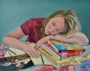 Oh, I’m a bit of a homebody with my hubby and son, but I do love a good comedy or art show, festivals, live music, hanging with my girlfriends, having fun occasions with them. I’m a bit of a soccer mom. I’m obsessed with my two cats, Kiwi and Luna. Mostly, I work in my studio on my off days from teaching, with a busy commission business, and listening to every sort of podcast, but loves me some Morbid, True Crime Garage, Generation Why, Smartless, Fly on the Wall, Radio Rental, Jordan Harbinger, Truth and Justice, Honestly to name a few. Can you tell I love true crime and comedy. I know, weird combo!