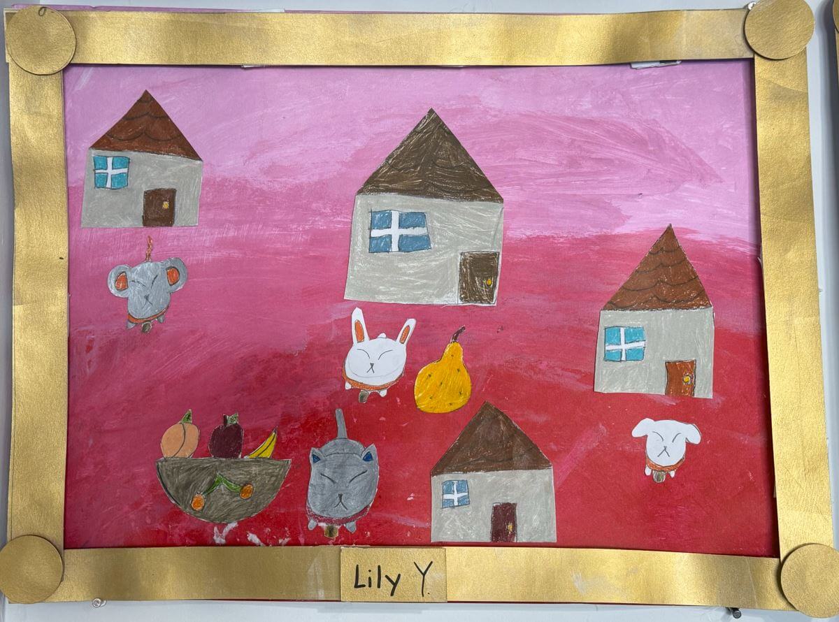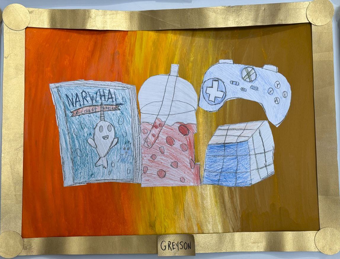 Essential Skills: Use of objects to show personal meaning. Use of color to show emotion. Bright color gradients as a background for figurative scenes. Practice layering both abstract patterns and representational objects/places.