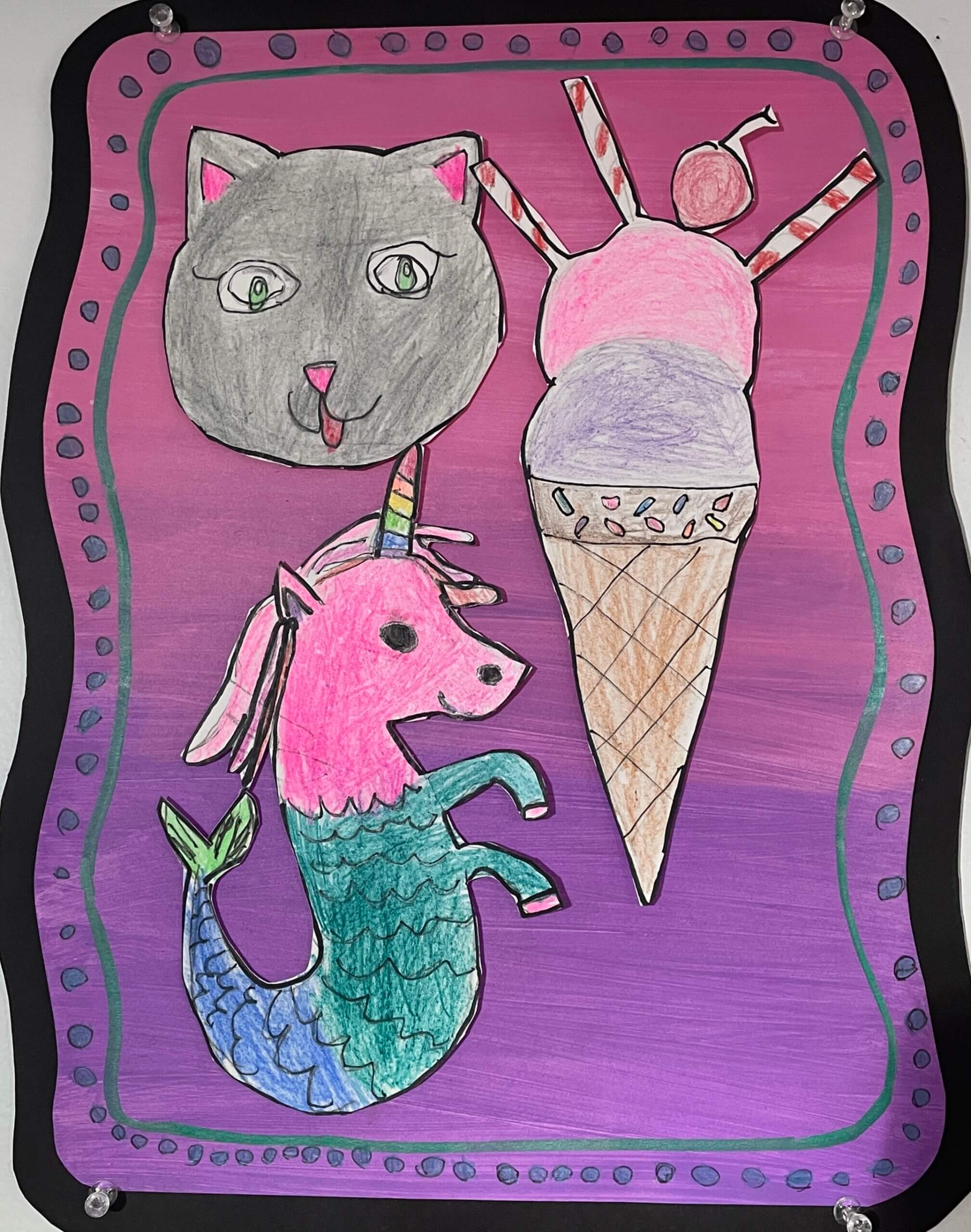 Overview: Students create a mixed media work inspired by the work of JJ Manford, combining representational drawing, colored pencil drawing, color gradient acrylic painting, and collage.