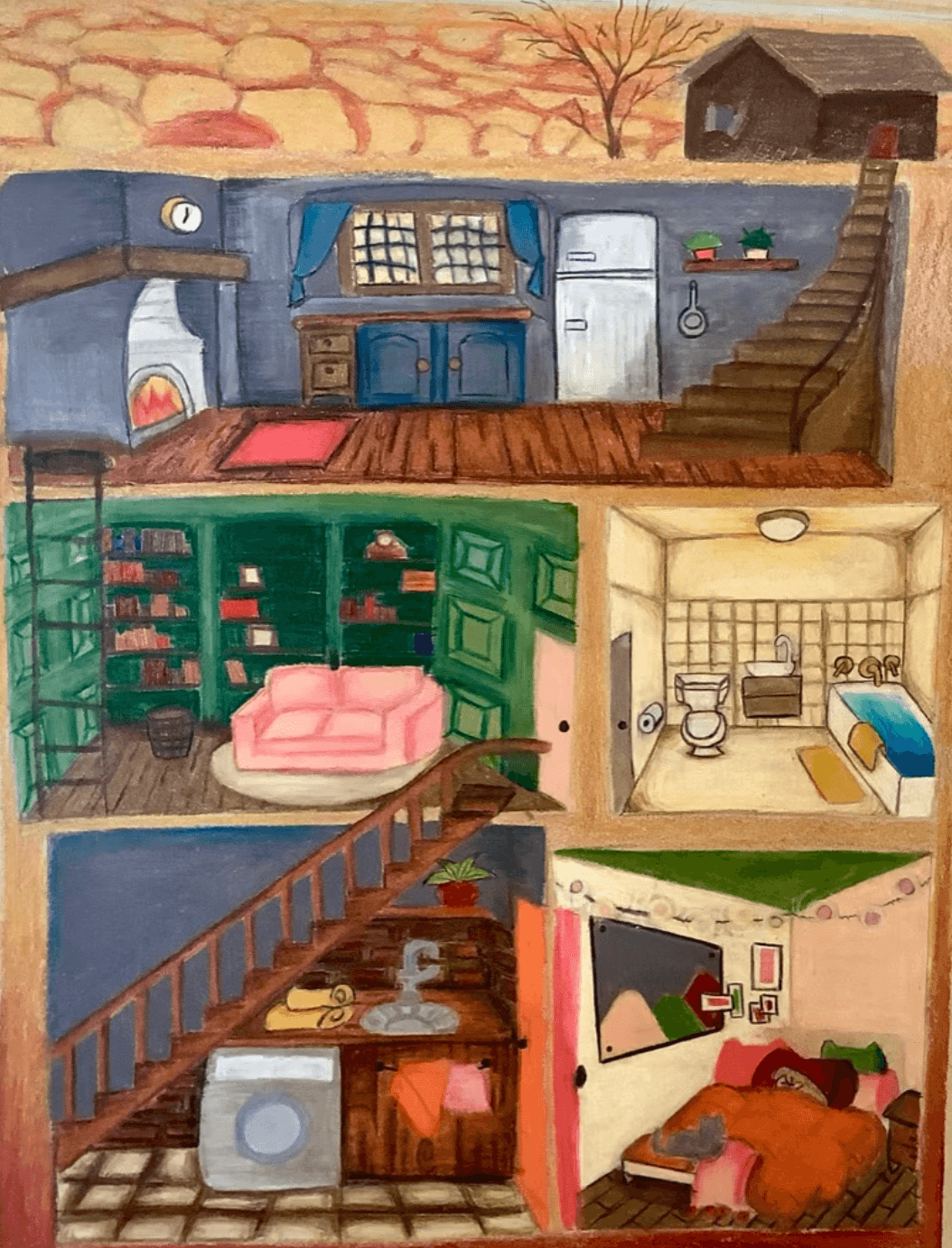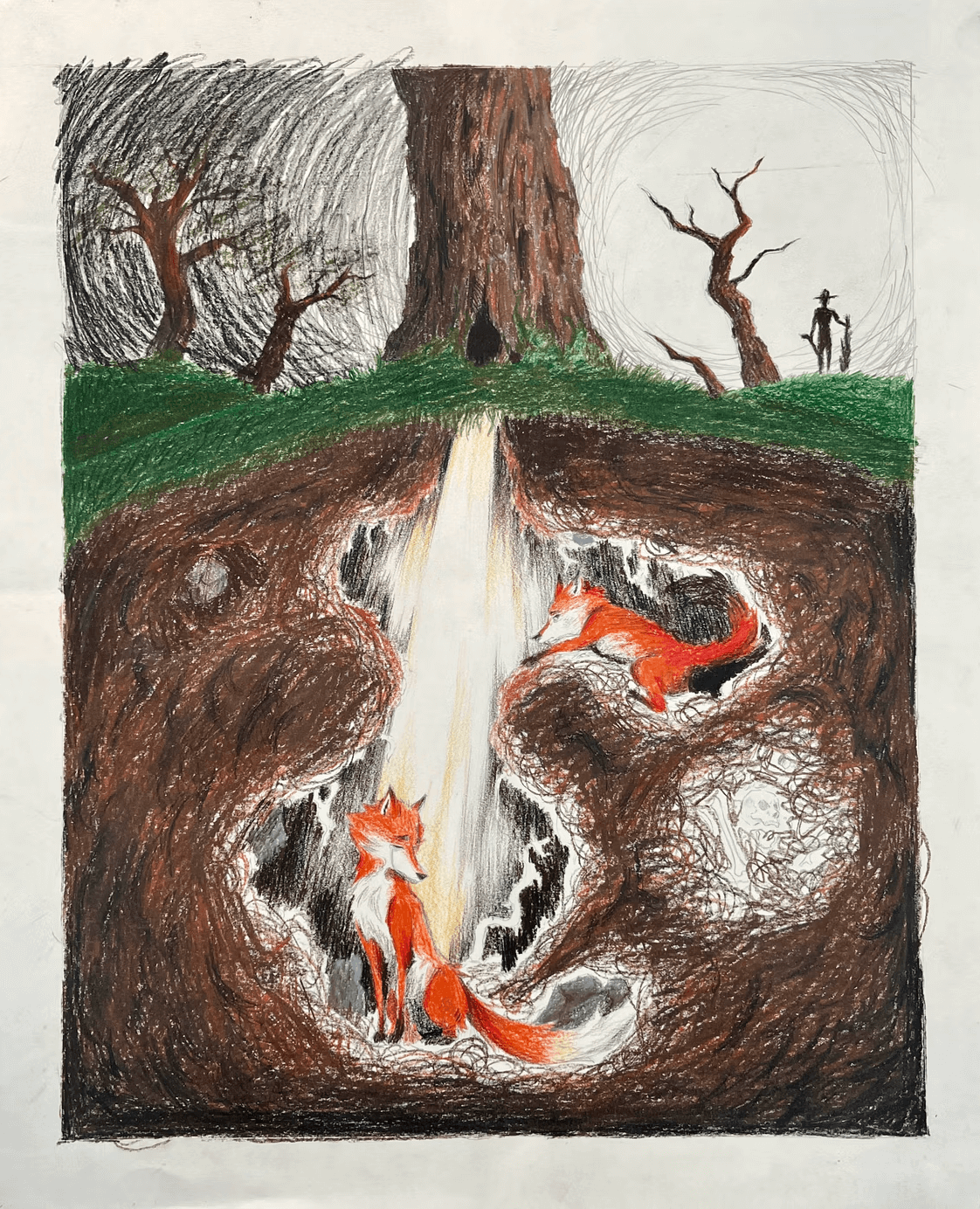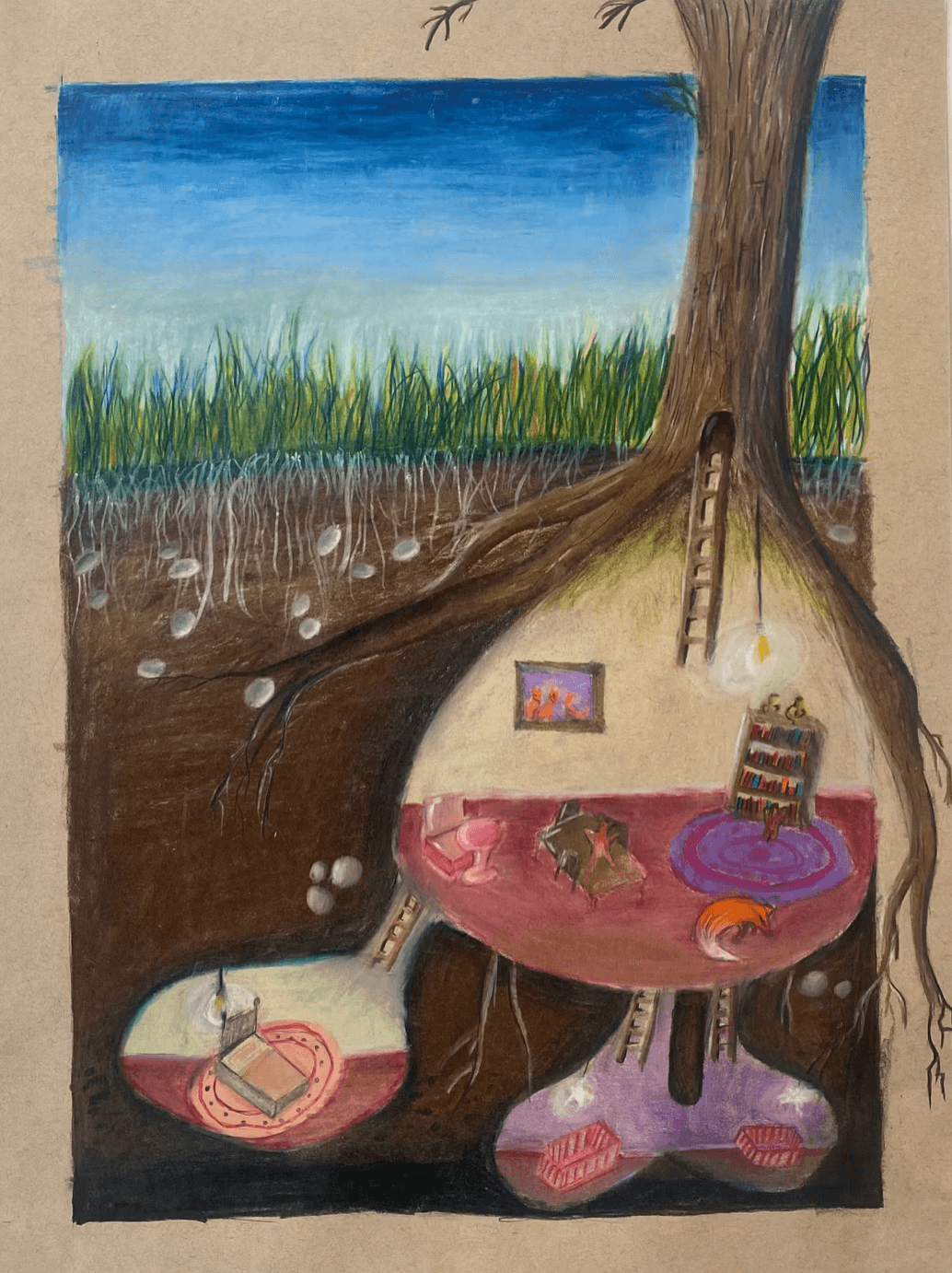 Overview: Colored pencils present many opportunities for creative expression, story telling, and personalized details. Using colored pencils, students create subterranean burrows with connecting tunnels to tell a story of an imaginative underground scene.