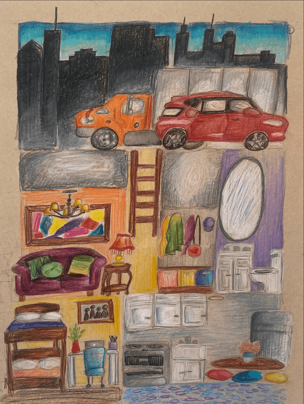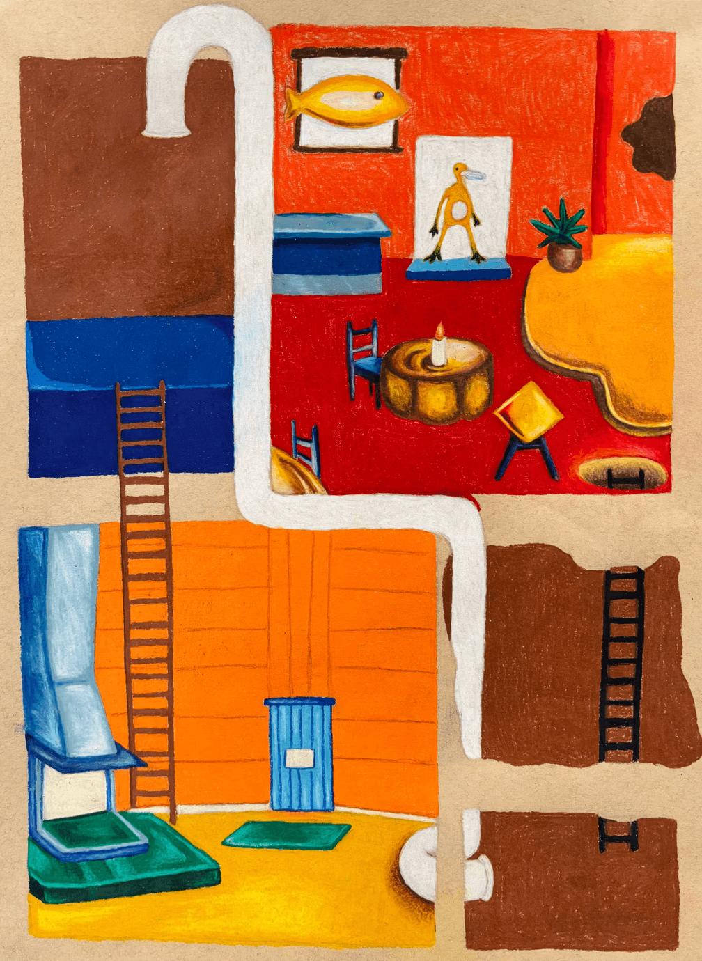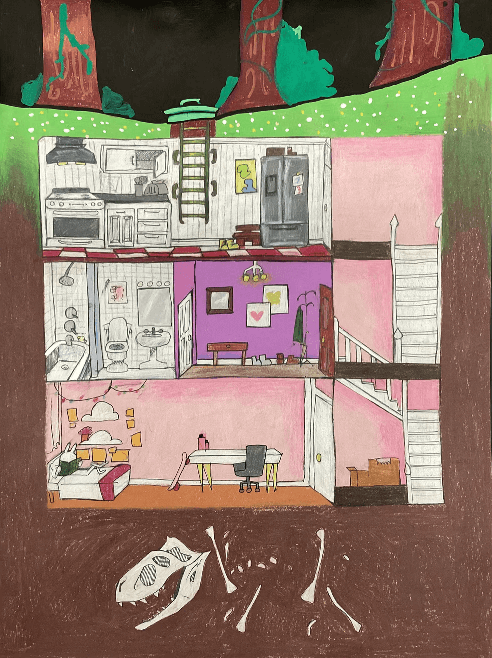 Overview: Colored pencils present many opportunities for creative expression, story telling, and personalized details. Using colored pencils, students create subterranean burrows with connecting tunnels to tell a story of an imaginative underground scene.